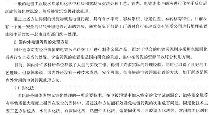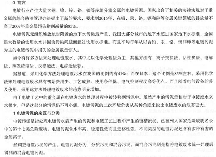 摘要——電鍍污泥含有一定量的銅、鎳、鉻、鋅等金屬,屬于危險(xiǎn)廢物。對(duì)其中的金屬(尤其是重金屬)進(jìn)行資源化利用,能有效地消除電鍍污泥重金屬的二次污染,同時(shí)也能帶來(lái)可觀的經(jīng)濟(jì)和環(huán)境效益。本文介紹了電鍍污泥的來(lái)源與分類,重點(diǎn)介紹了電鍍污泥的國(guó)內(nèi)外處理方法,為今后的研究提供一些思路,最大限度的減少重金屬污染。